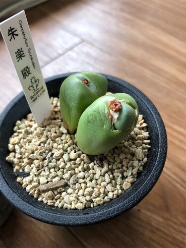 去年、国際多肉植物協会主催の多肉バザールで手に入れたConophytum Syurakuden 朱楽殿がようやく脱皮し始めた。 リトープス類はもうすっかり脱皮中だけど、この子はゆっくりしたペースでこれから脱皮するみたい。